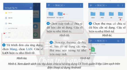 Thực hành trang 37 Tin học 12: Nhiệm vụ 3. Sử dụng tệp, thư mục được chia sẻ cho các máy tính trong cùng một mạng máy tính trên thiết bị thông minh chạy hệ điều hành Android