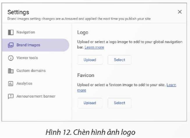 Bên dưới phần đặt tên trang web, nháy chọn Add logo (Thêm biểu tượng). Xuất hiện hộp thoại Settings (Cài đặt) (Hình 12), chọn mục Brand images (Hình ảnh thương hiệu).