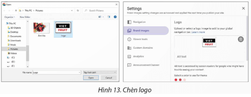 Trong mục Logo, chọn Upload (Tải lên), xuất hiện đường dẫn chọn thư mục chứa hình ảnh lưu trên máy tính, chọn hình ảnh, chọn Open (Hình 13).
