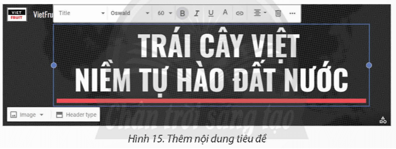 5. Nhập tiêu đề “TRÁI CÂY VIỆT NIỀM TỰ HÀO ĐẤT NƯỚC” vào mục “YOUR PAGE TITLE” của trang web, thực hiện kéo thả để căn chỉnh khung văn bản cho hợp lí (Hình 15). Khi nhập tiêu đề, gõ tổ hợp phím Shift + Enter để ngắt nội dung xuống dòng.