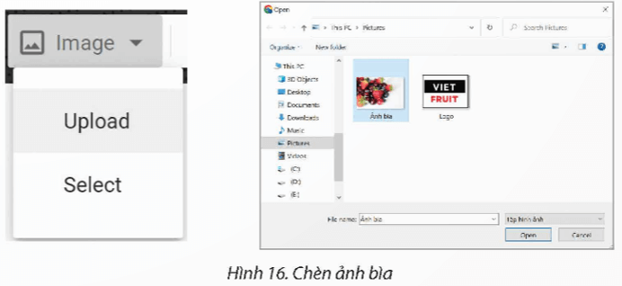 Nháy chọn Image (Thay đổi hình ảnh), chọn Upload (Tải lên), xuất hiện đường dẫn chọn thư mục chứa hình ảnh trên máy tính, chọn hình ảnh (Hình 16), chọn Open.