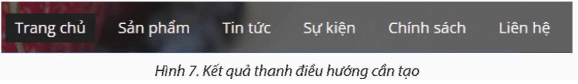 Yêu cầu: Sử dụng trang web chủ đề bán hàng đã tạo trong " thiết kế thanh điều hướng và tạo các trang (chưa có dữ liệu): Sản phẩm, Tin tức, Sự kiện, Chính sách, Liên hệ. Thực hiện các thao tác trên trang như: thay đổi vị trí hiển thị, nhân bản, ẩn, xoá, đổi tên để thiết kế thanh điều hướng theo mẫu như Hình 7.