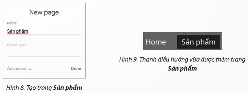 chọn New page. Xuất hiện hộp thoại New page (Hình 8), nhập tên trang cần tạo là “Sản phẩm” và chọn Done.