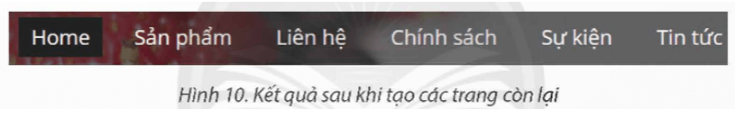 Tương tự, tạo các trang Liên hệ, Chính sách, Sự kiện, Tin tức để đạt kết quả như Hình 10.