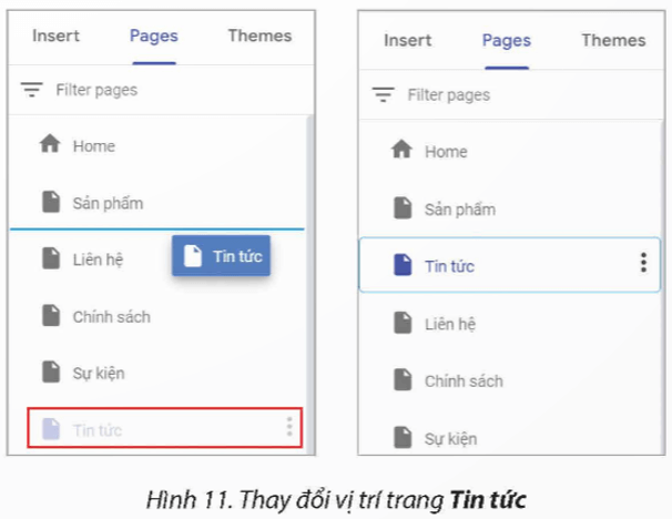 Thay đổi vị trí hiển thị trang: Để thay đổi thứ tự vị trí của trang Tin tức, em kéo thả trang Tin tức đến vị trí mới (Hình 11). Thực hiện di chuyển tương tự với các trang còn lại để được kết quả như Hình 7.