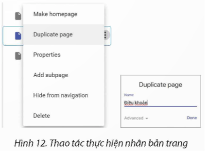 nằm bên phải trang cần nhân bản (ví dụ trang Tin tức), chọn Duplicate page. Tại hộp thoại Duplicate, nhập tên trang là “Điều khoản” và chọn “Done” (Hình 12).