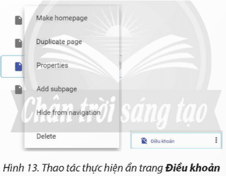 nằm bên phải trang cần ẩn (trang Điều khoản), chọn Hide from navigation, trang sẽ được ẩn (Hình 13). Để hiển thị trang đã ẩn, em nháy chọn biểu tượng