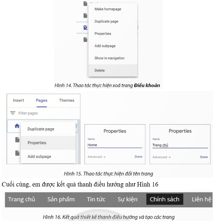 Đổi tên trang: Để đổi tên trang Home thành Trang chủ, nháy chọn biểu tượng % nằm bên phải trang Home và chọn Properties. Trong mục Name của hộp thoại Properties, nhập vào tên mới “Trang chủ” và chọn Done (Hình 15).