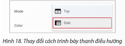 2. Trong mục Mode (phần tử xuất hiện nhiều nhất), chọn Side (bên) (Hình 18) để thanh điều hưởng có dạng dọc hoặc chọn Top (trên cùng) để thanh điều hướng có dạng ngang.