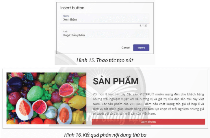 Nháy chọn thẻ Insert, công cụ Bottom. Tại hộp thoại Insert button, nhập “Xem thêm” ở mục Name, ở mục Link, chọn trang Sản phẩm (trang cần liên kết). Chọn Insert để chèn nút (Hình 15).