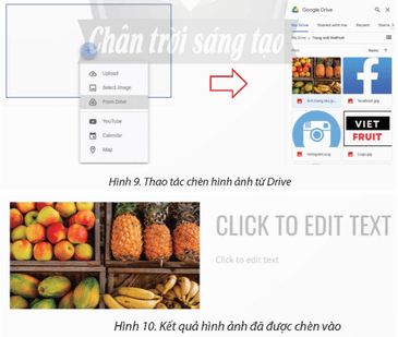 Chèn hình ảnh vào cột bên trái: Nháy chọn biểu tượng +, xuất hiện các tuỳ chọn. Chọn hình ảnh tù nguồn phù hợp, ví dụ From Drive (Hình 9), chọn Insert. Em được kết quả như Hình 10.