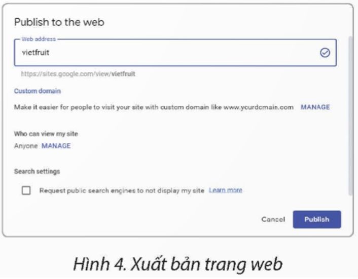 Chọn Publish để xuất bản trang web. Sau khi xuất bản liên kết trang web như sau: https://sites.google.com/ view/vietfruit.