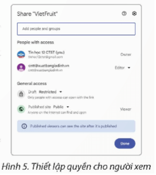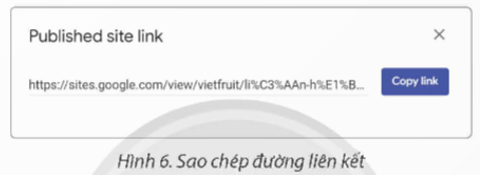 Trên thanh công cụ, nháy chọn biểu tượng G. Copy published site link. Trong hộp thoại Published site link (Hình 6), chọn Copy link để sao chép liên kết trang web. Chia sẻ liên kết vừa sao chép đến hai bạn trong lớp.