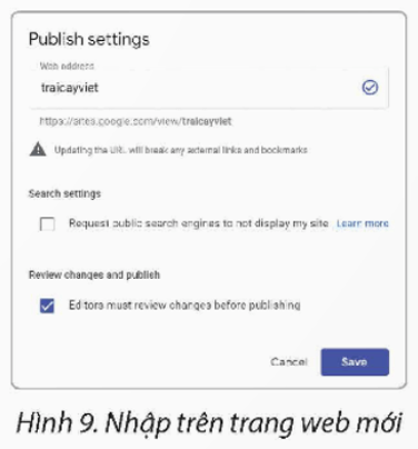 Thay đổi tên trang web thành “traicayviet”: Trên thanh công cụ, nháy chọn biểu tượng mũi tên bên phải biểu tượng Publish, chọn Publish settings. Tại hộp thoại Publish settings, nhập tên mới “traicayviet” ở mục Web address và nháy chọn Save (Hình 9).