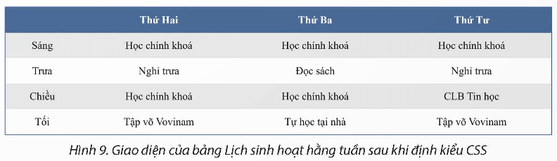 Để định kiểu riêng cho bảng Lịch sinh hoạt hằng tuần mà không làm ảnh hưởng bảng khác, em khai báo vùng chọn là lớp my-table và các vùng chọn liên quan lớp này. Các bước thực hiện như sau: