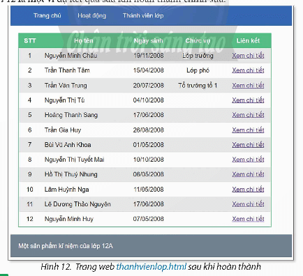 Khởi động trang 129 Tin học 12: Theo em nên dùng thẻ gì để trình bày một bảng danh sách tên học sinh trên trang web?
