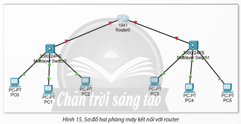 Thực hành 1 trang 178 Tin học 12: Em hãy thiết lập cấu hình mô phỏng cho hai phòng máy, mỗi phòng gồm 3 máy tính kết nối với switch, hai phòng máy kết nối với nhau thông qua router như Hình