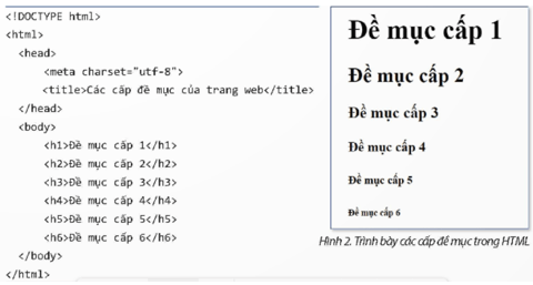 Để định nghĩa các đề mục của trang web theo từng cấp độ, HTML sử dụng các thẻ <h1>, <h2>, <h3>, <h4>, <h5>, <h6>. Trong đó <h1> là đề mục cao cấp nhất và <h6> là đề mục cấp thấp nhất. Trình duyệt sẽ hiển thị các đề mục theo các kích thước khác nhau, đề mục cấp cao hơn sẽ có kích thước chữ lớn hơn.