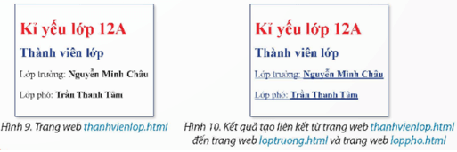 Thực hành trang 80 Tin học 12: Yêu cầu: Em hãy tạo trang web thanhvienlop.html có nội dung như ở Hình 9 và hai trang web giới thiệu về lớp trưởng và lớp phó, đặt tên lần lượt là loptruong.html và loppho.html. Sau đó tạo liên kết từ trang web thanhvienlop.html đến hai trang web loptruong.html và loppho. html như ở Hình 10.
