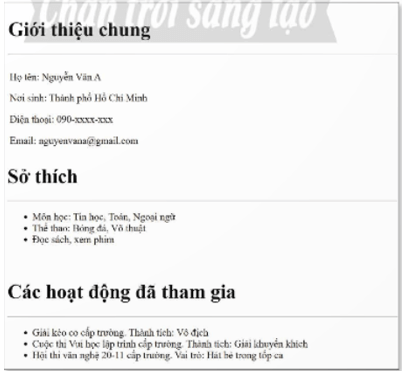 Vận dụng 2 trang 80 Tin học 12: Em hãy bổ sung Sở thích và Các hoạt động đã tham gia cho trang web portfolio.html, sử dụng các thẻ tạo danh sách và các thẻ định dạng văn bản đơn giản đã học. Hình 11 là một ví dụ kết quả sau khi hoàn thành chỉnh sửa.