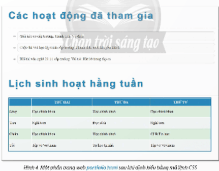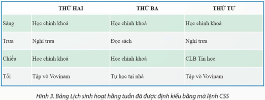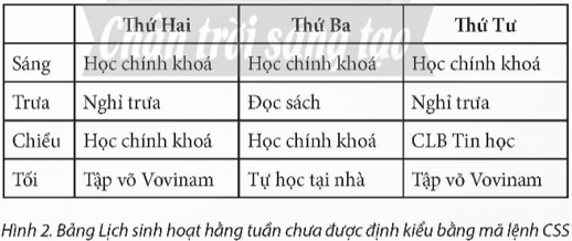Yêu cầu: Viết mã lệnh CSS để định kiểu bảng Lịch sinh hoạt hằng tuần thoả các yêu cầu: Bảng có chiều rộng chiếm 75% chiều rộng của trang web và có đường viền nét liền màu xanh dày 2 pixels.