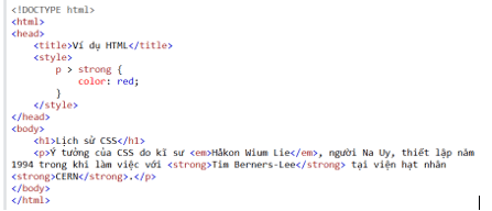Nếu thay mẫu em ~ strong bằng p > strong, kết quả sẽ không thay đổi. Lí do là trong cấu trúc HTML, phần tử <strong> đang nằm trực tiếp trong phần tử <p>. Do đó, cả hai trường hợp em ~ strong và p > strong đều sẽ chọn phần tử <strong> đó và áp dụng các định dạng CSS tương ứng.