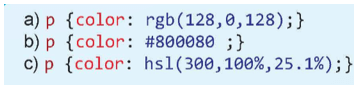 c) p {color: hsl (300,100%,25.1%);} sử dụng giá trị HSL để thiết lập màu. Trong trường hợp này, giá trị HSL là (300, 100%, 25.1%), tương ứng với màu tím.