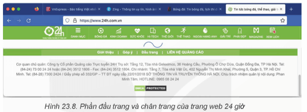 Luyện tập 1 trang 133 Tin học 12: Hãy phân tích phần đầu trang và chân trang của trang web 24 giờ ở Hình 23.8 và chỉ rõ các vị trí các phần tử mà em nhận dạng được: tên trang, logo, favicon, bảng chọn,... Tóm tắt những thông tin được trình bày ở phần chân trang.