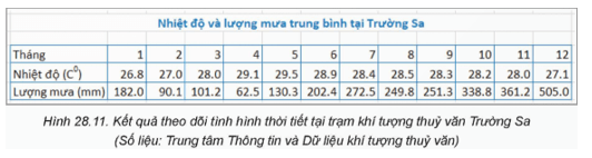 Dữ liệu trong Hình 28.11 cho thấy nhiệt độ và lượng mưa trung bình hàng tháng tại Trường Sa. Dựa trên dữ liệu này, chúng ta có thể rút ra các thông tin hữu ích như sau: