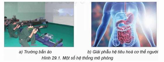 Ví dụ 1. Trường bắn ảo (Hình 29.1a) là một ứng dụng mô phỏng huấn luyện bắn súng bộ binh đã được triển khai ở Việt Nam, cho phép luyện tập, nâng cao kĩ thuật ngắm, bắn cho bộ đội trước khi bắn đạn thật trên thao trường. Ứng dụng này cho phép mô phỏng các đối tượng mục tiêu, thực địa trong môi trường đồ hoạ ba chiều (3D), mô phỏng âm thanh, hình ảnh của quá trình tương tác thực – ảo, mô phỏng hiện tượng giật của súng tương tự như khi bắn đạn thật,...