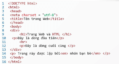 Hoạt động 2 trang 41 Tin học 12: Quan sát tệp HTML sau em có nhận xét gì về cấu trúc chung của một trang web?