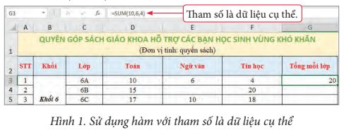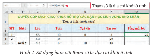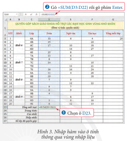 Em hãy lựa chọn hàm phù hợp (ở Bảng 1) để tính các giá trị Trung bình, Cao nhất, Thấp nhất, Số lớp quyên góp được đối với sách giáo khoa môn Toán (ở Hình 3). Nêu các bước nhập hàm vào ô tính để tính các giá trị đó.