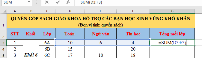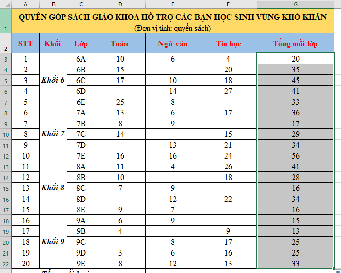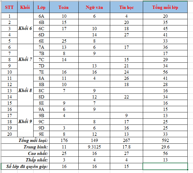 Em hãy trao đổi với bạn để xuất cách tính Tổng mỗi lớp (tổng số sách Toán, Ngữ Văn, Tin học mỗi lớp đã quyên góp), Tổng mỗi loại (tổng số sách các lớp đã quyền góp theo môn học), Trung bình (số sách trung bình các lớp đã quyền góp theo môn học), Cao nhất, Thấp nhất (số sách cao nhất, thấp nhất đã quyên góp theo môn học), Số lớp đã quyên góp (tổng số lớp đã quyền góp được ít nhất một cuốn sách trở lên theo môn học).