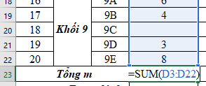 Các hàm ở ô tính E23: = SUM(E3:E22); ô F23: = SUM(F3:F22).