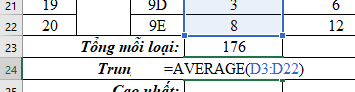 - Trung bình: (nhập vào ô D24) = AVEGARE(D3:D22), tương tự các cột E và F.