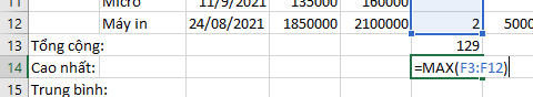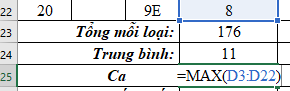 - Cao nhất: (nhập vào ô D25)= MAX(D3:D22), tương tự với các cột E và F.
