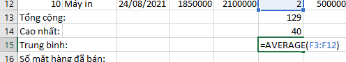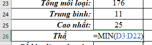 - Thấp nhất: (nhập vào ô D26)= MIN(D3:D22), tương tự với các cột E và F.