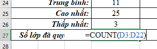 - Số lớp quyên góp được đối với sách giáo khoa môn Toán: (nhập vào ô D27) = COUNT(D3:D22).