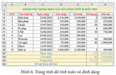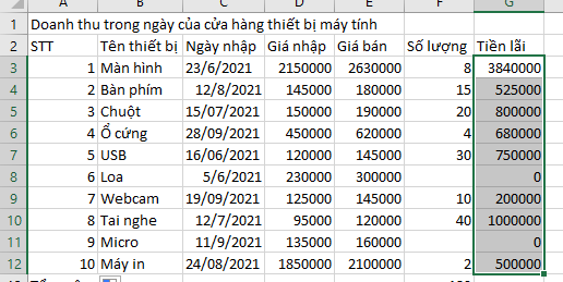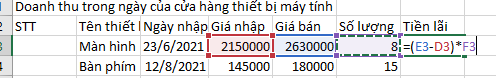 a) Lập công thức tính tiến lãi của mặt hàng đầu tiên. Sao chép công thức để tính Tiền lãi cho các thiết bị còn lại (Tiền lãi = (Giá bán - Giá nhập) × Số lượng).