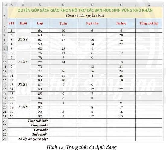 Hình 12 (Bài 10, Trang 50) là bảng theo dõi quyên góp sách giáo khoa lớp 6 ba môn Toán, Ngữ văn, Tin học để hỗ trợ các bạn học sinh vùng khó khăn của một trường trung học cơ sở.