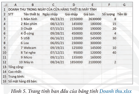 Mở bảng tính Doanh thu.xlsx (do giáo viên cung cấp, như Hình 5).