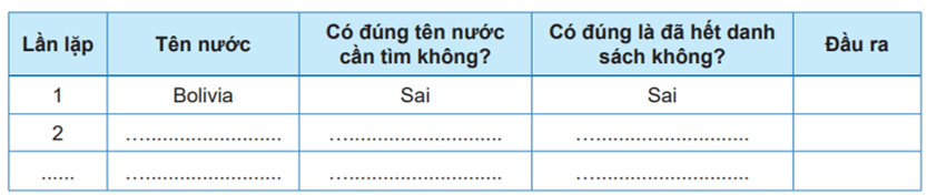 Em hãy kẻ Bảng 14.3 vào vở và điền các bước thực hiện thuật toán tìm kiếm tuần tự để tìm tên nước Iceland trong danh sách trên (dòng 1 là ví dụ minh hoạ).