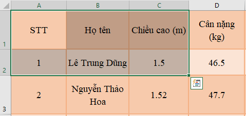 Bài 2 trang 41 Tin học lớp 7: Chèn thêm một hàng mới sát ngay dưới hàng dữ liệu của Nguyễn Thảo Hoa, sau đó nhập dữ liệu. Tạm bỏ trống các ô BMI, Đánh giá, sau này sẽ tự động cập nhập theo công thức.