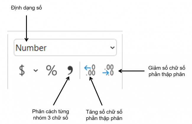 Câu 2. Các lệnh trong nhóm lệnh Number để thao tác nhanh chọn một định dạng số và tác dụng của các lệnh đó là: