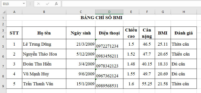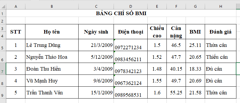 1. Thêm cột Ngày sinh và nhập số liệu cho Bảng chỉ số BMI của một nhóm.