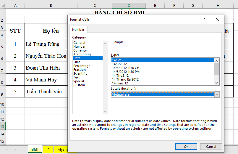 - Bước 2. Mở hộp Fomart Cells, nháy chuột chọn Date trong danh sách Categogy.