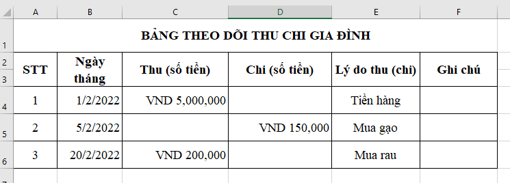 Gợi ý: mỗi khoản thu hoặc chi ghi trên một dòng, các thông tin cần có gồm: ngày tháng, thu (số tiền), chi (số tiền), lý do thu (chi), hiện còn (số tiền), …Tạo bảng trong trang “MySheet” và nhập dữ liệu.