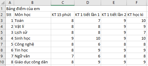 Hãy lập bảng tính để quản lí các khoản chi tiêu của gia đình em hoặc lập bảng điểm học tập của em.