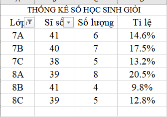+ Sau khi bộ lọc được áp dụng, chỉ các lớp có tỉ lệ số học sinh giỏi của lớp lớn hơn tỉ lệ học sinh giỏi của toàn trường sẽ được hiển thị trong bảng dữ liệu.