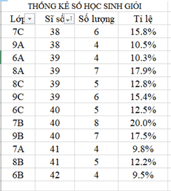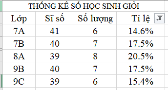 - Lọc theo điều kiện để hiển thị chỉ các lớp có tỉ lệ số học sinh giỏi của lớp lớn hơn tỉ lệ học sinh giỏi của toàn trường.